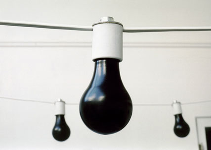 25 Watt light bulbs have been spray painted with black, heat resistant spray. When turned on one cannot see any light. One can only feel the warmth they radiate.The windows of the gallery space have been covered with black mirror glass. Thus, when standing in front of them, one cannot see the world outside, but only the mirror image of oneself and the interior space.