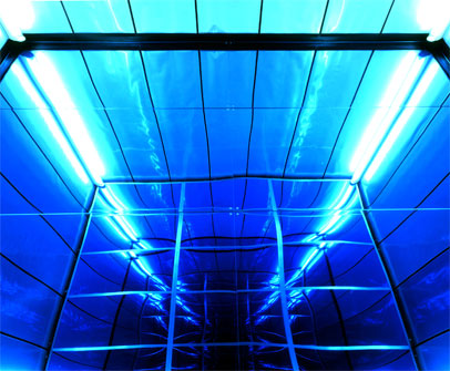 The entire ceiling and the floor of the elevator have been covered with blue plexiglas mirror. There is one 8 foot fluorescent light in each corner which illuminate the space and underscore the vertical extension. Upon entering the elevator the viewer has the feeling as if walking into a bottomless space. The blue mirrors on the ceiling and the floor create infinite vertical reflections, transforming the usually very confined environment of the elevator into an endless illusion of space. While the elevator goes up or down, the viewer experiences a loss of orientation. One feels as if riding into infinity.