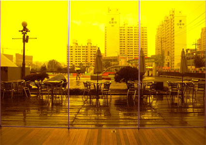 An intensely yellow filter, usually used in film productions to simulate sunshine, has been applied directly to the glass walls. This filter changes the color of the daylight and creates the illusion of supernatural sunshine inside and outside the gallery space. When looking through the glass walls, the viewer’s perception of the world outside is altered and everything becomes extremely bright, oddly intense and unreal. This artificial sunshine remains the same, no matter what the weather is like outside. It creates an atmosphere that is equally beautiful and disturbing. |